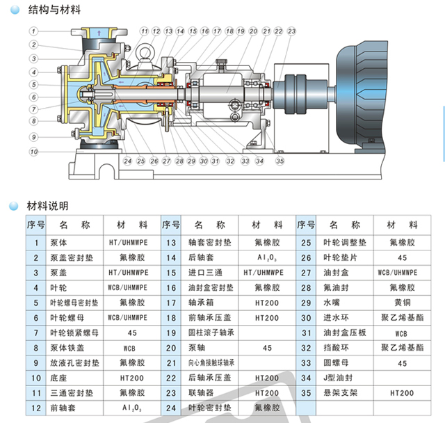 采用軸向進口,徑向出口方式,葉輪采用半開式、流道寬,在輸送含有顆粒的漿料時不易堵塞,抗結晶、耐顆粒。