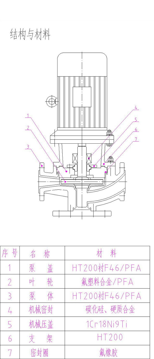1、GF系列氟塑料管道泵為立式結構,進出口口徑相同,且位于同一中心線上;